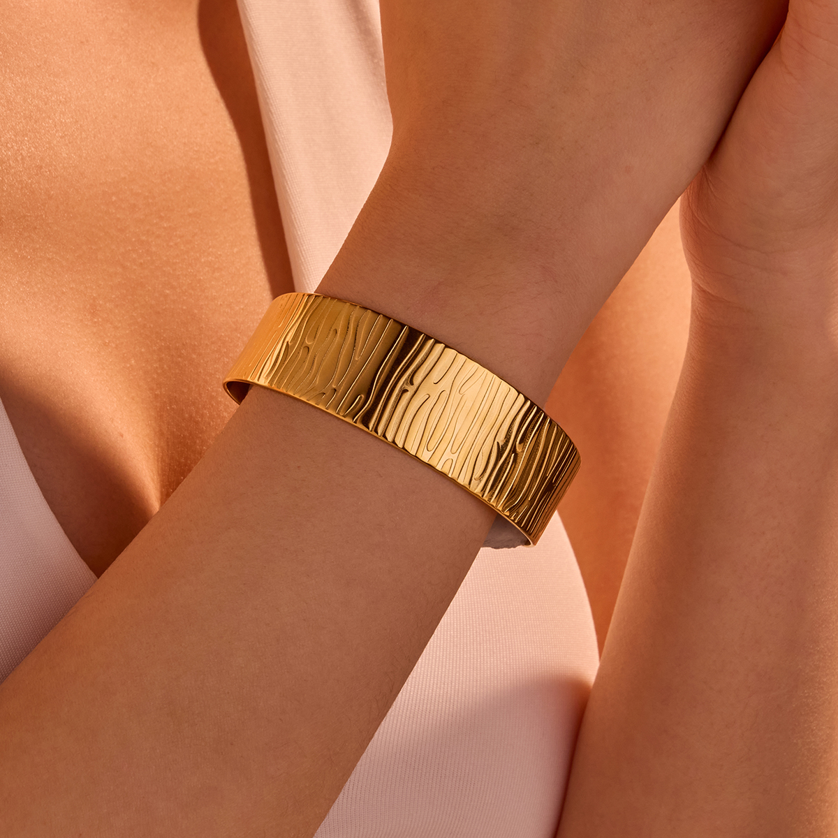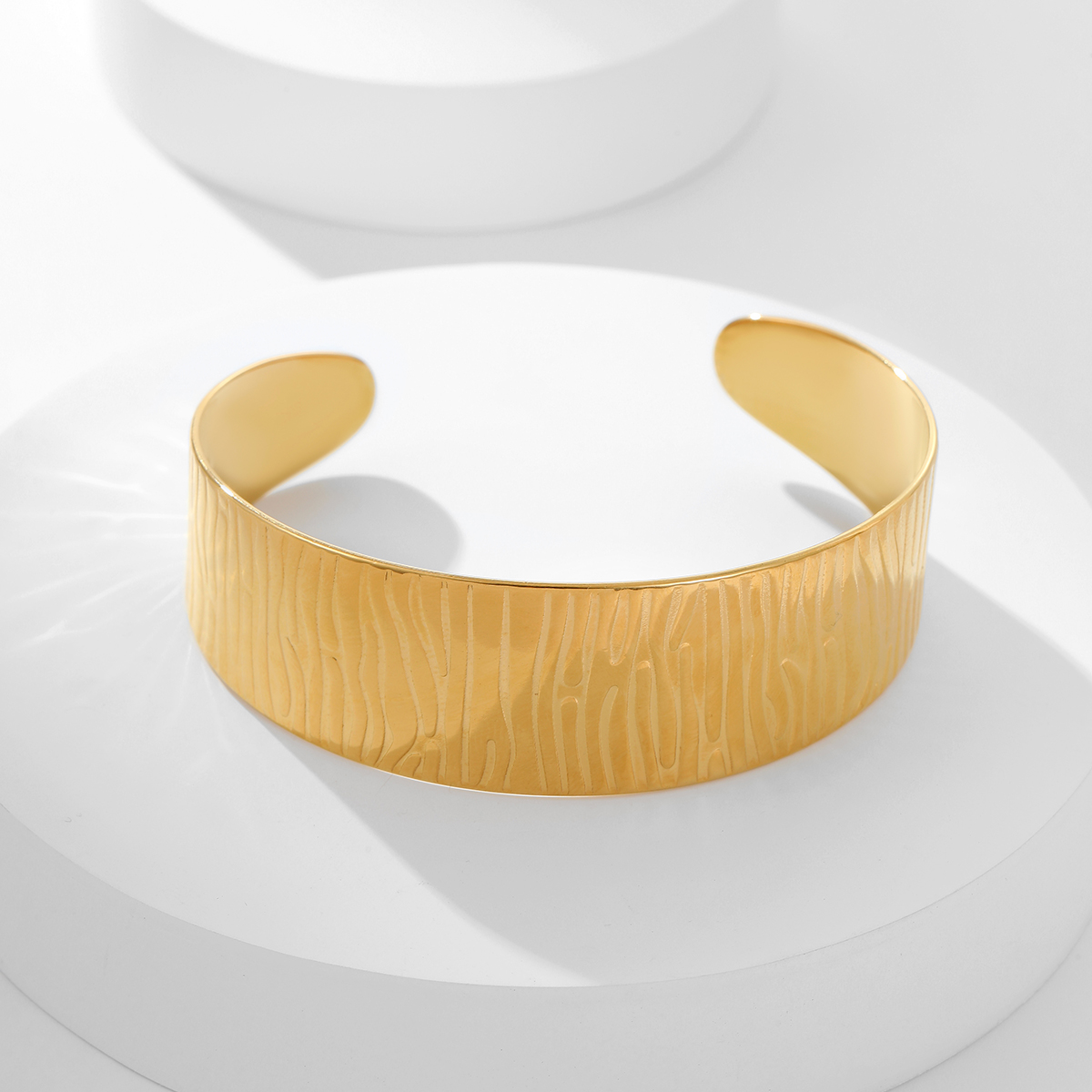 "不锈钢开口18K镀金锤纹宽手镯"