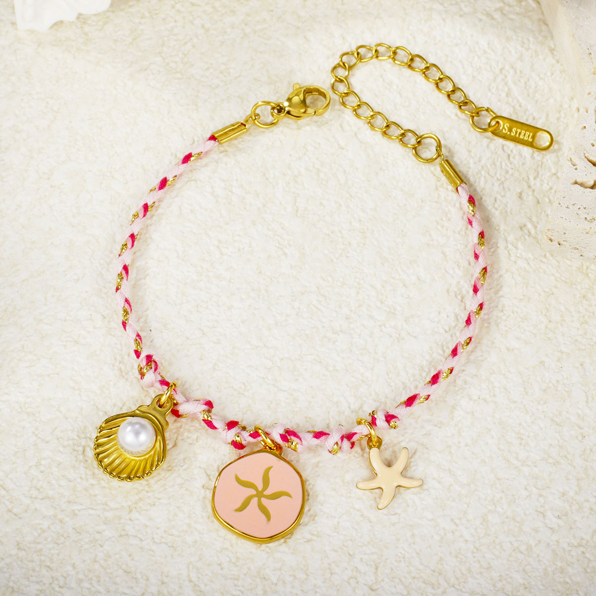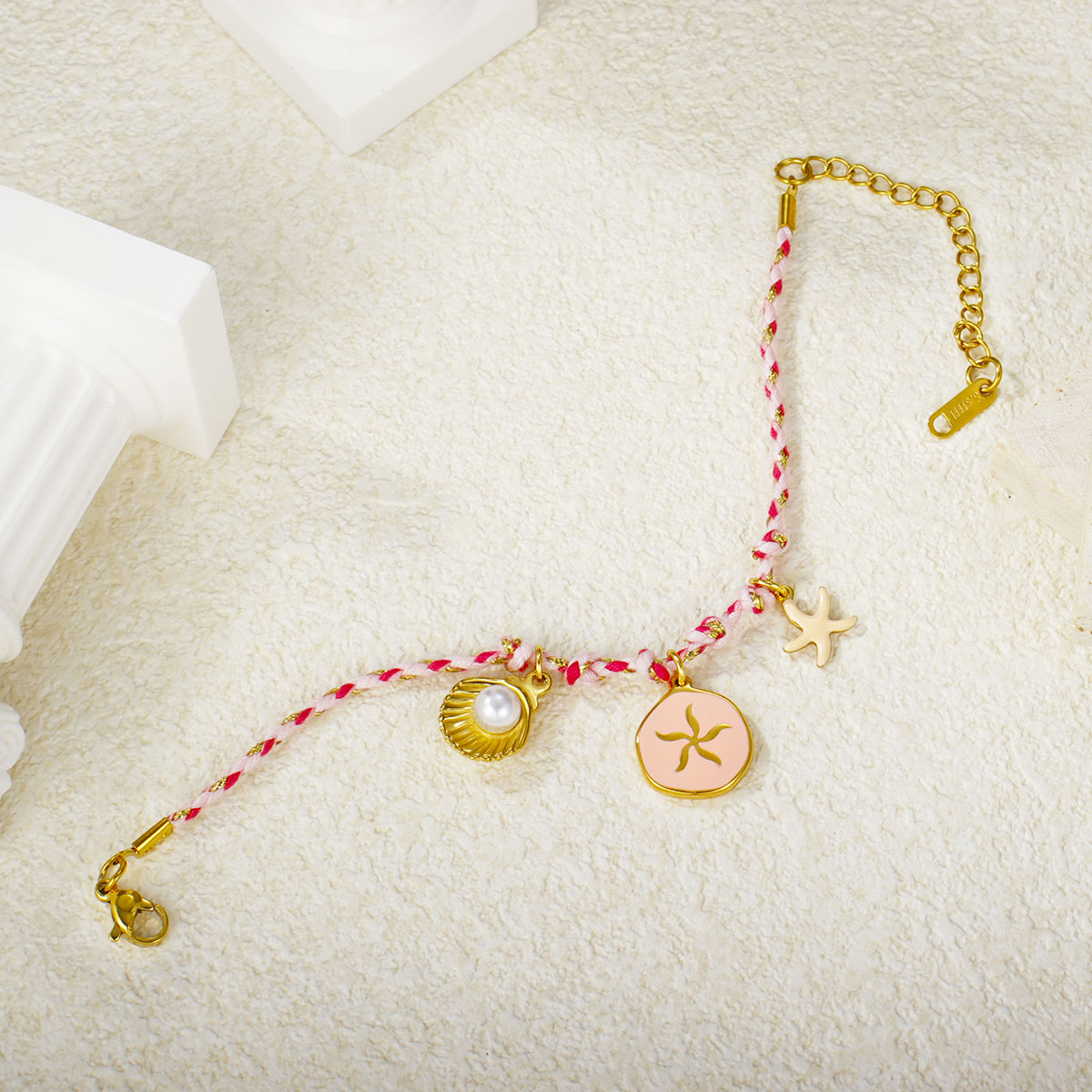 "女士时尚18K镀金扇贝吊坠手链彩色绳编"