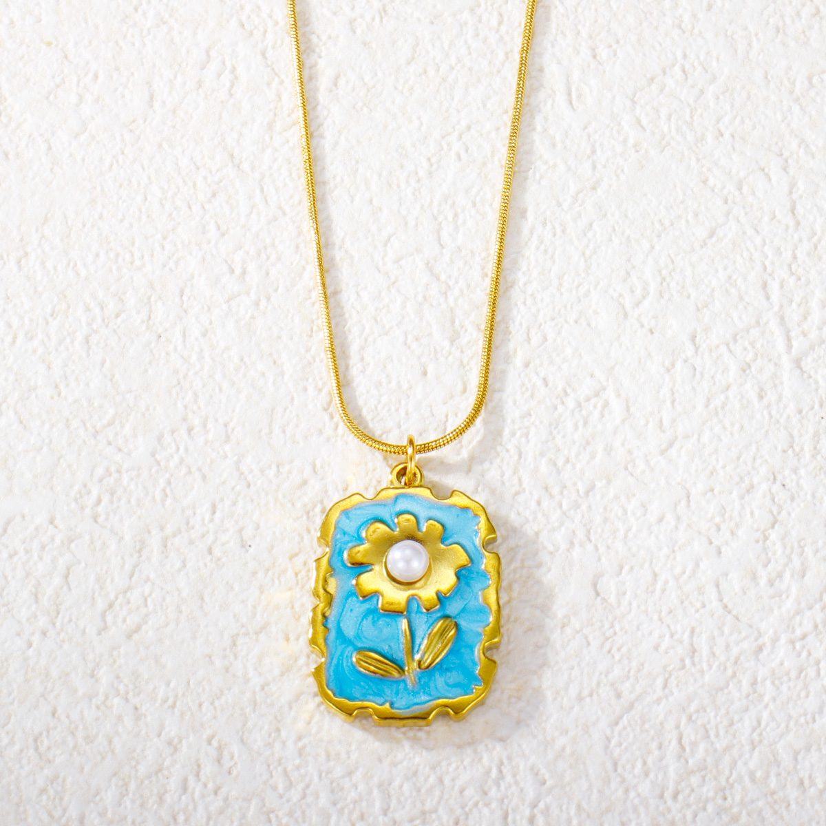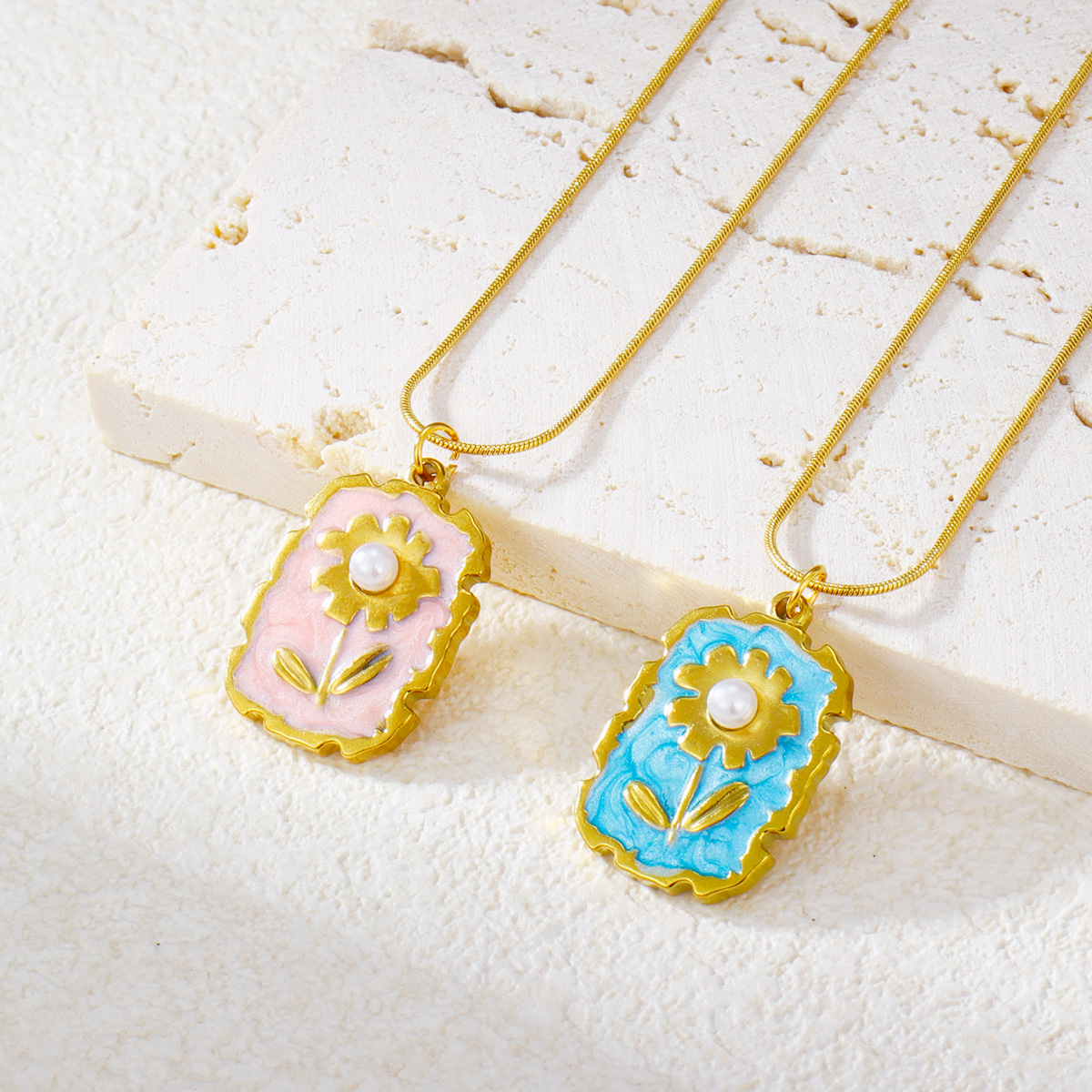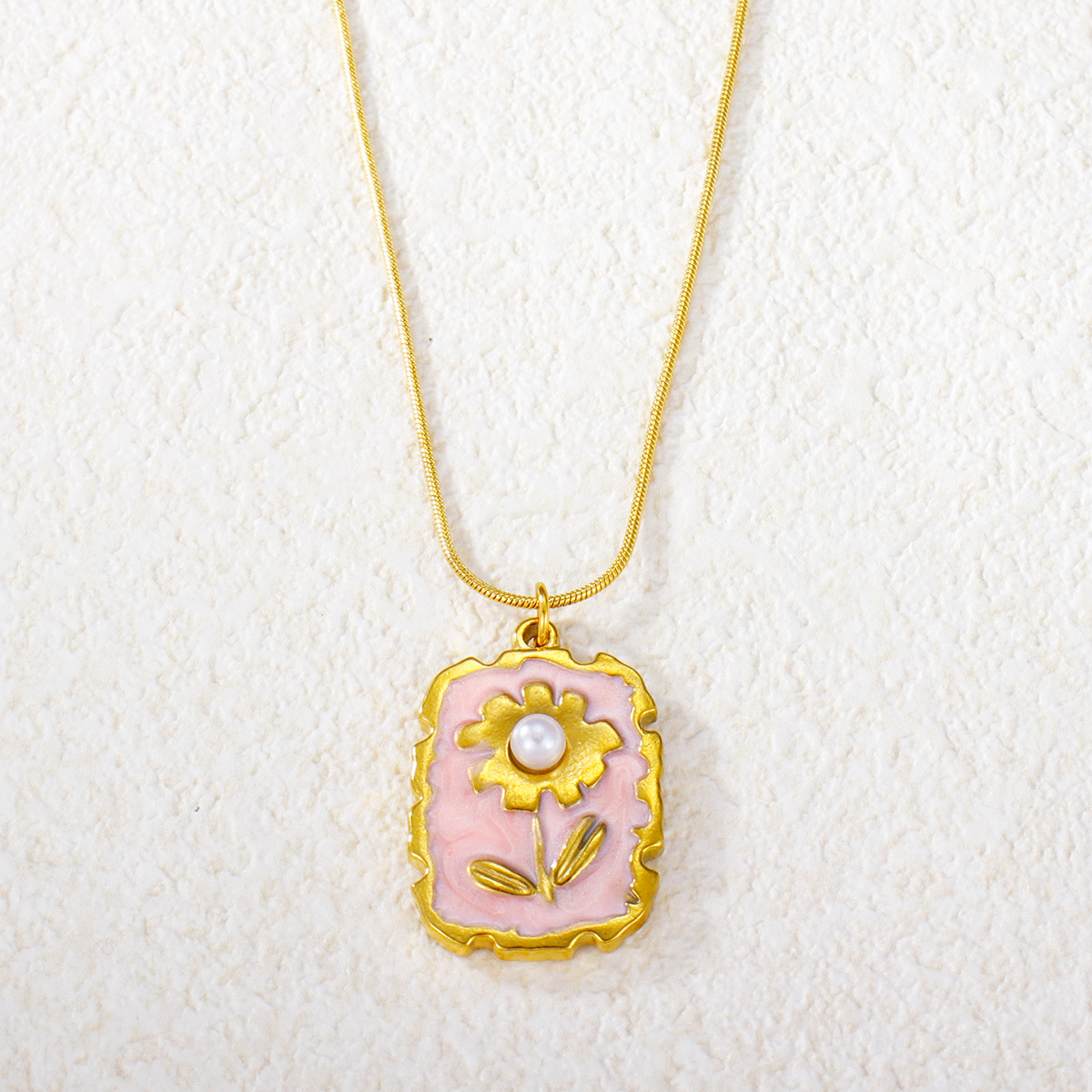 18K镀金滴油花镶嵌珍珠不锈钢项链