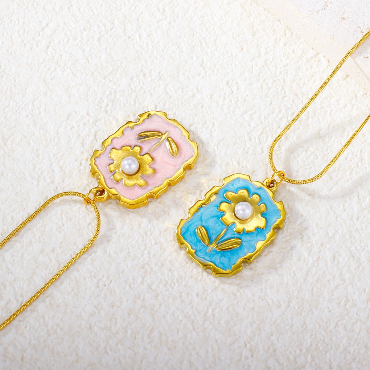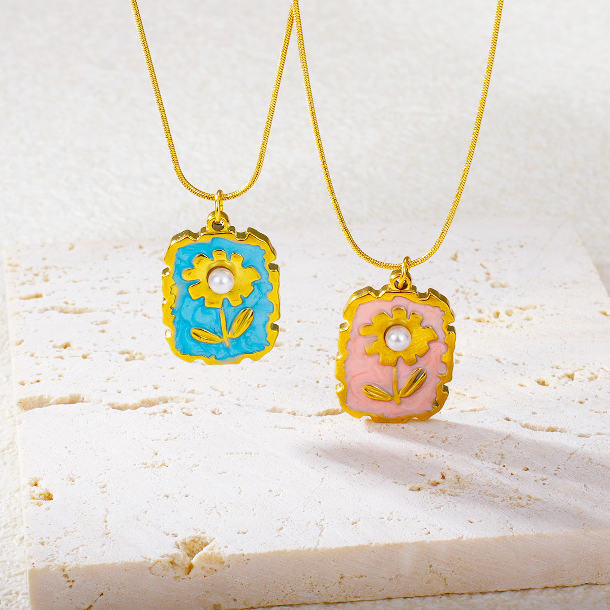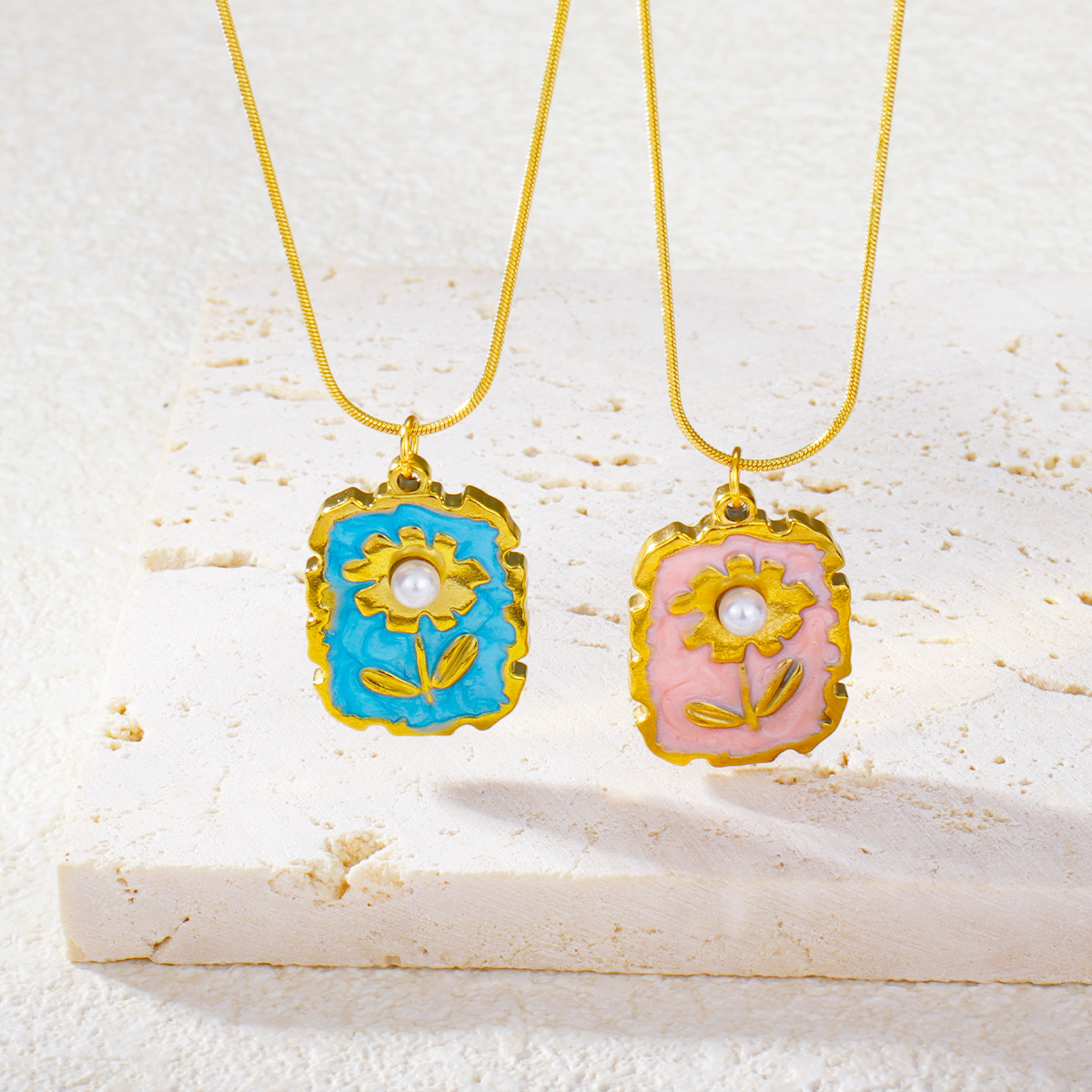 18K镀金滴油花镶嵌珍珠不锈钢项链