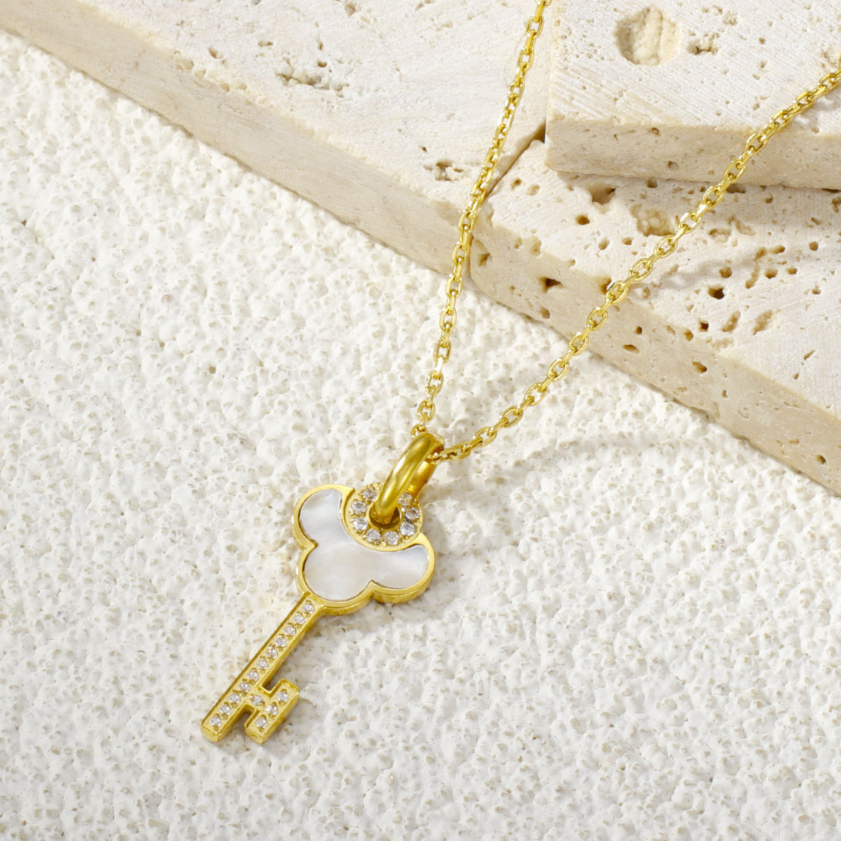 不锈钢锁骨链项链镶满钻石的贝壳钥匙吊坠
