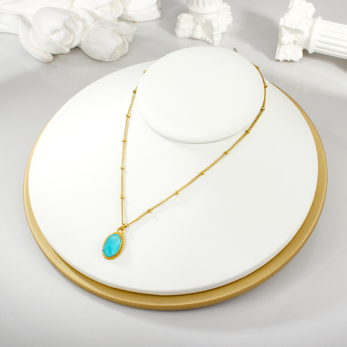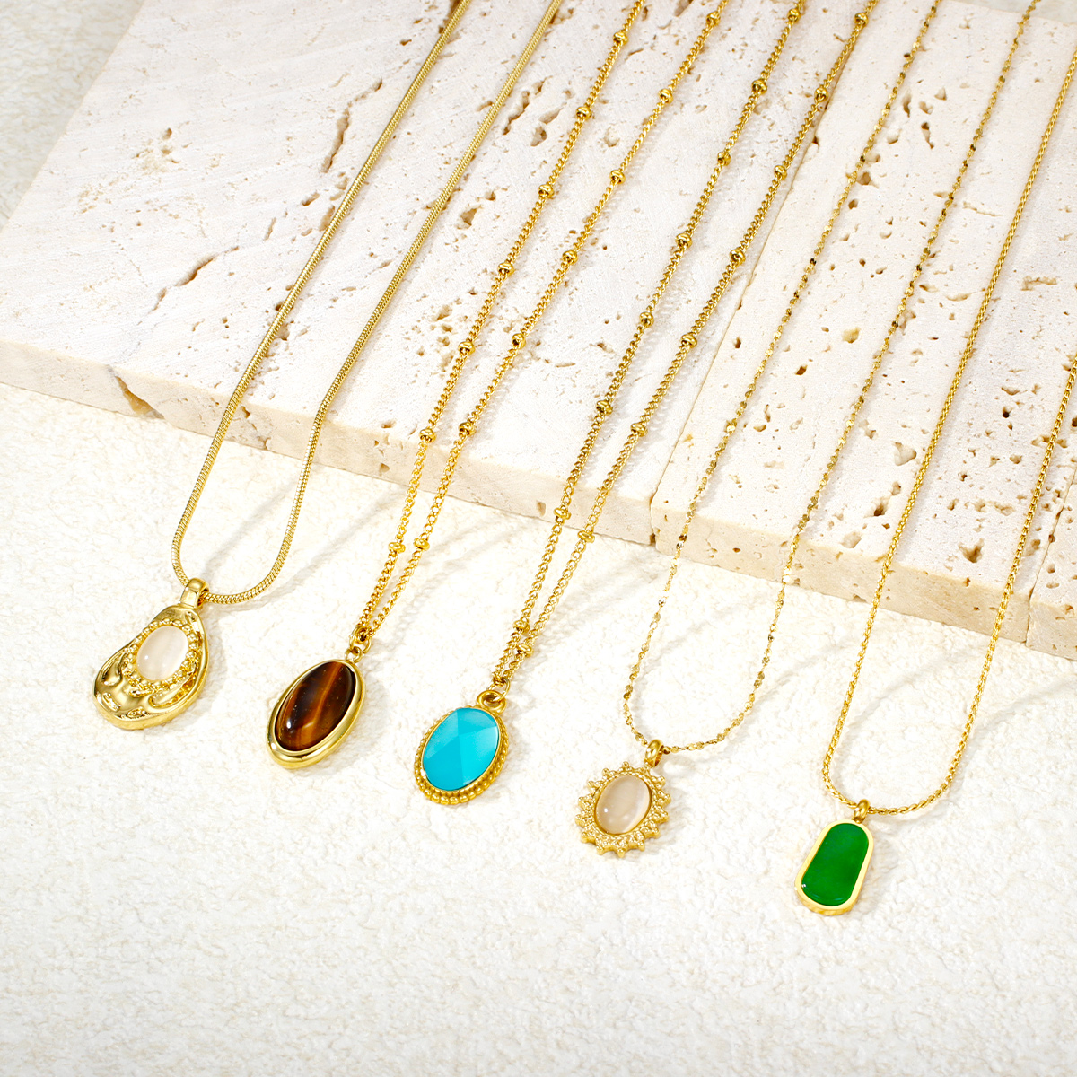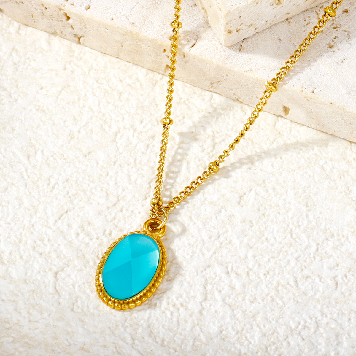 时尚18K镀金不锈钢细链椭圆形绿蓝色天然石吊坠项链