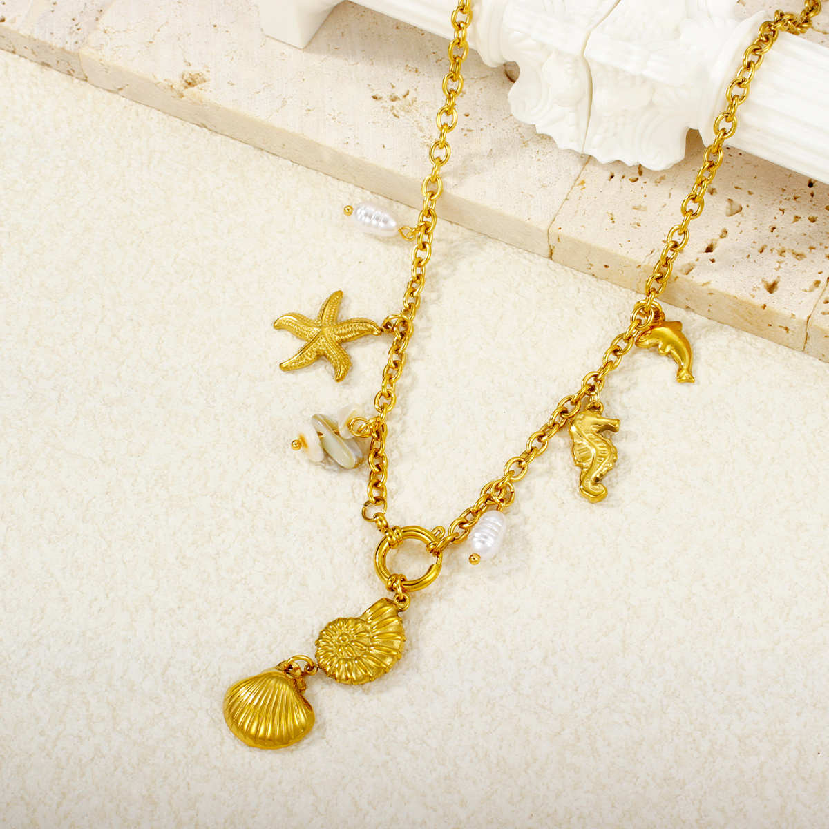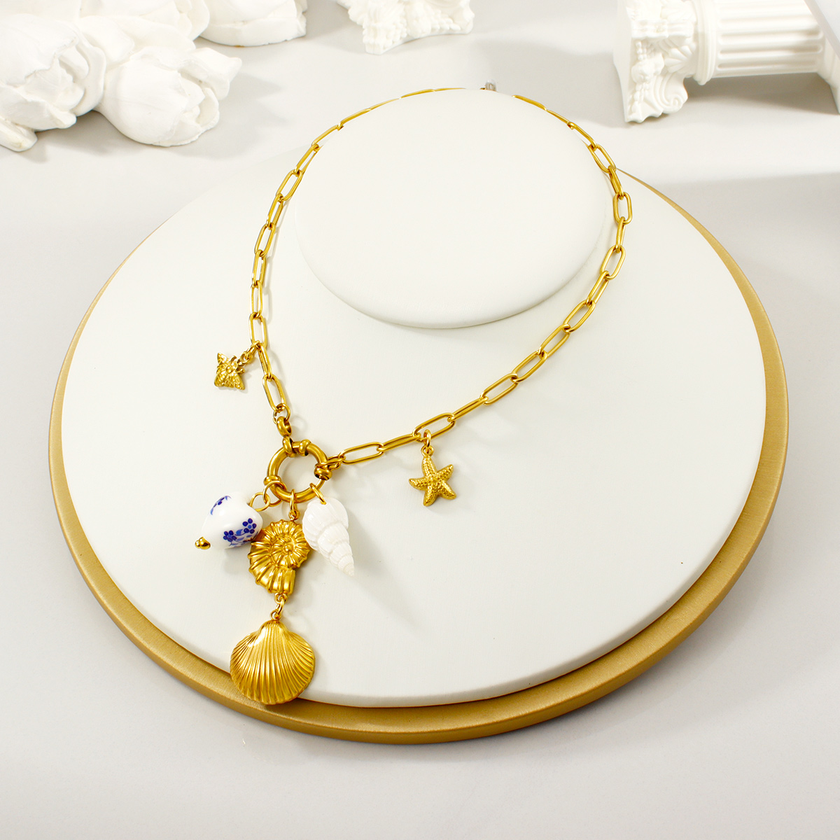 时尚18K镀金不锈钢太阳贝壳陶瓷鱼项链