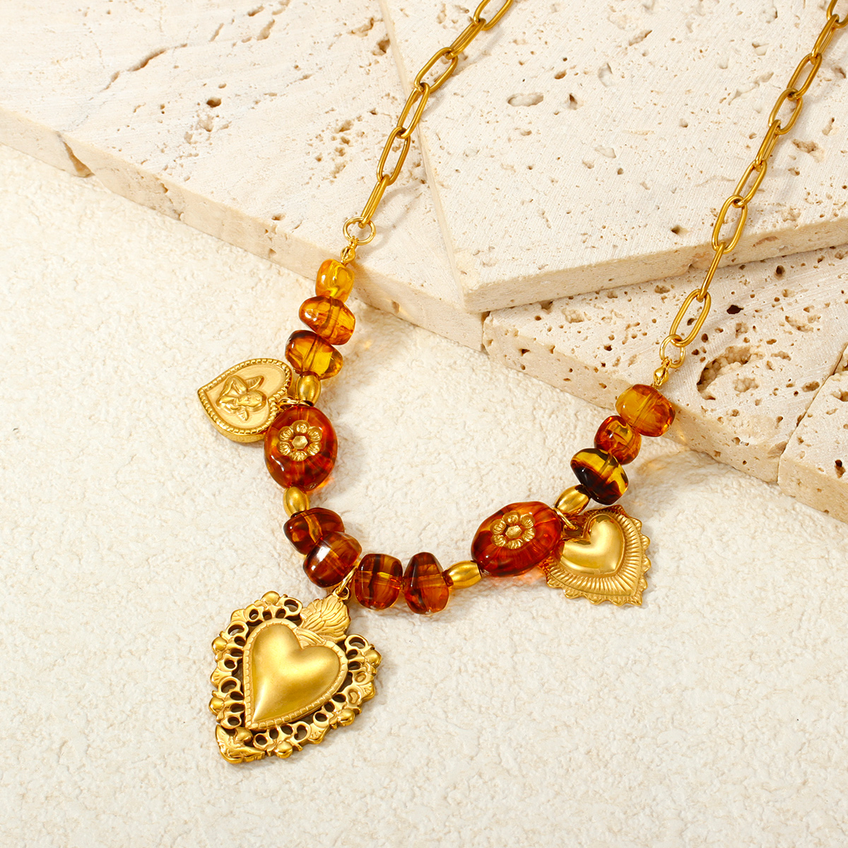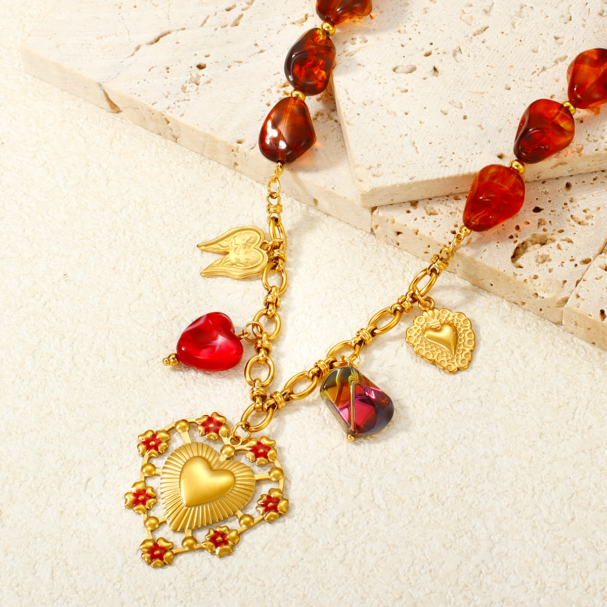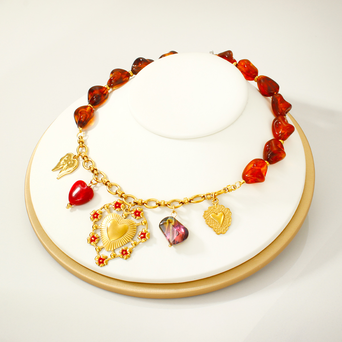 "手工树脂珠项链,18K镀金不锈钢心形吊坠,女士DIY时尚饰品"