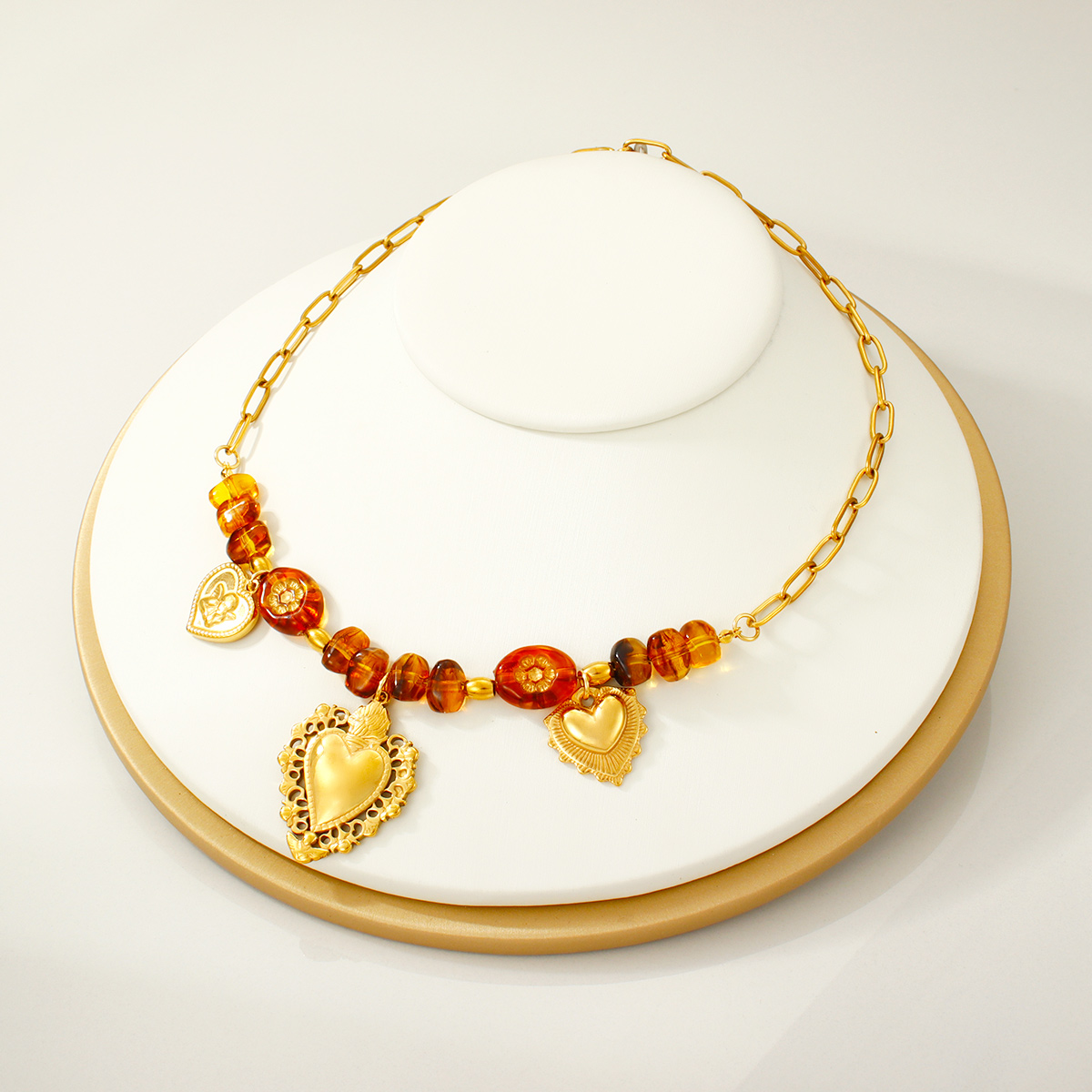 "手工树脂珠项链,18K镀金不锈钢心形吊坠,女士DIY时尚饰品"